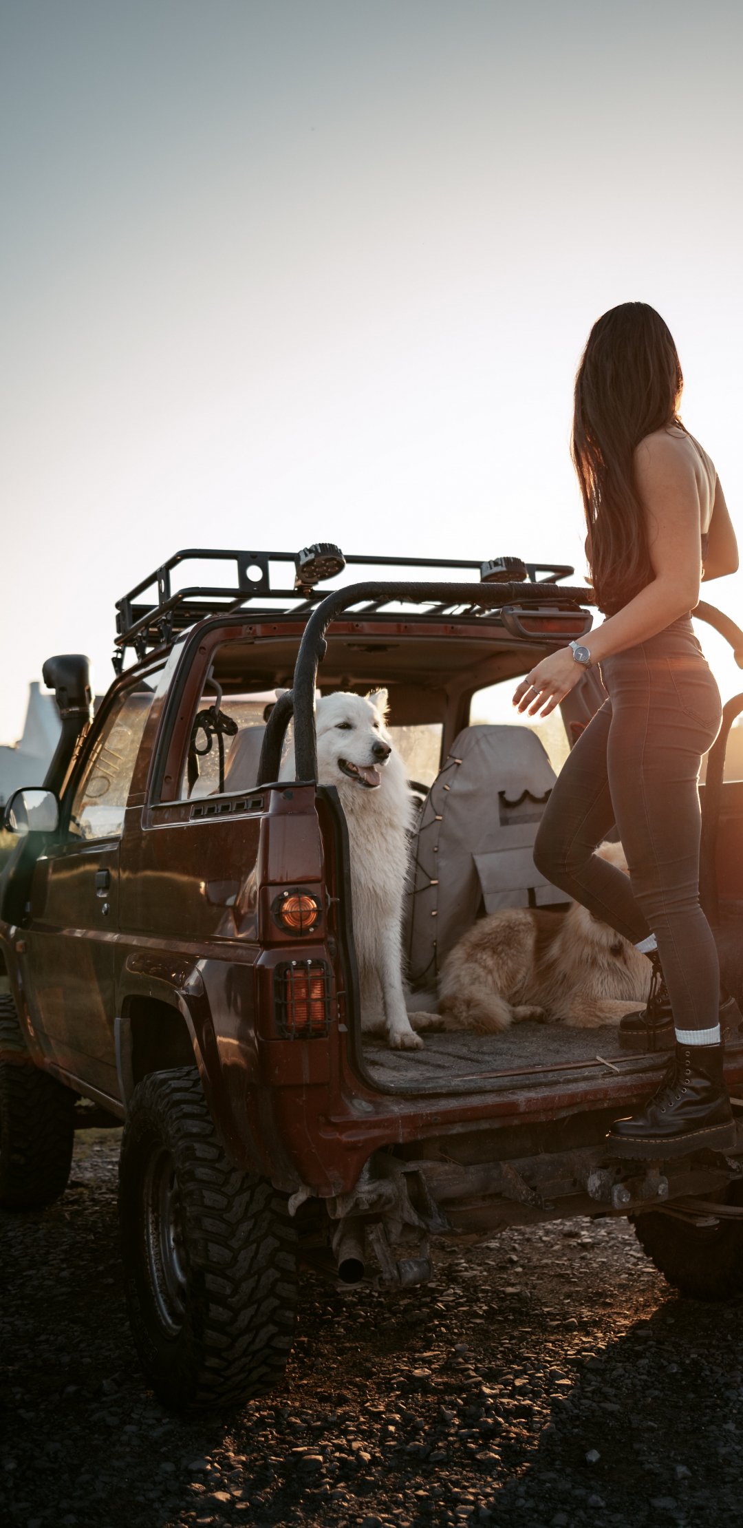Обои: машина с собаками, девушка - 1080x2220