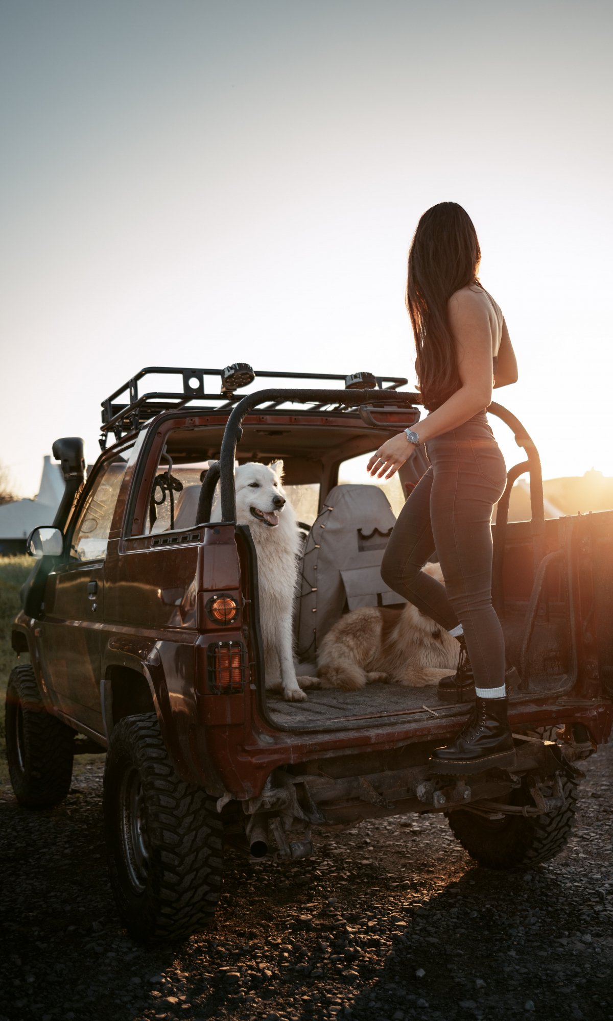 Обои: машина с собаками, девушка - 1200x2000
