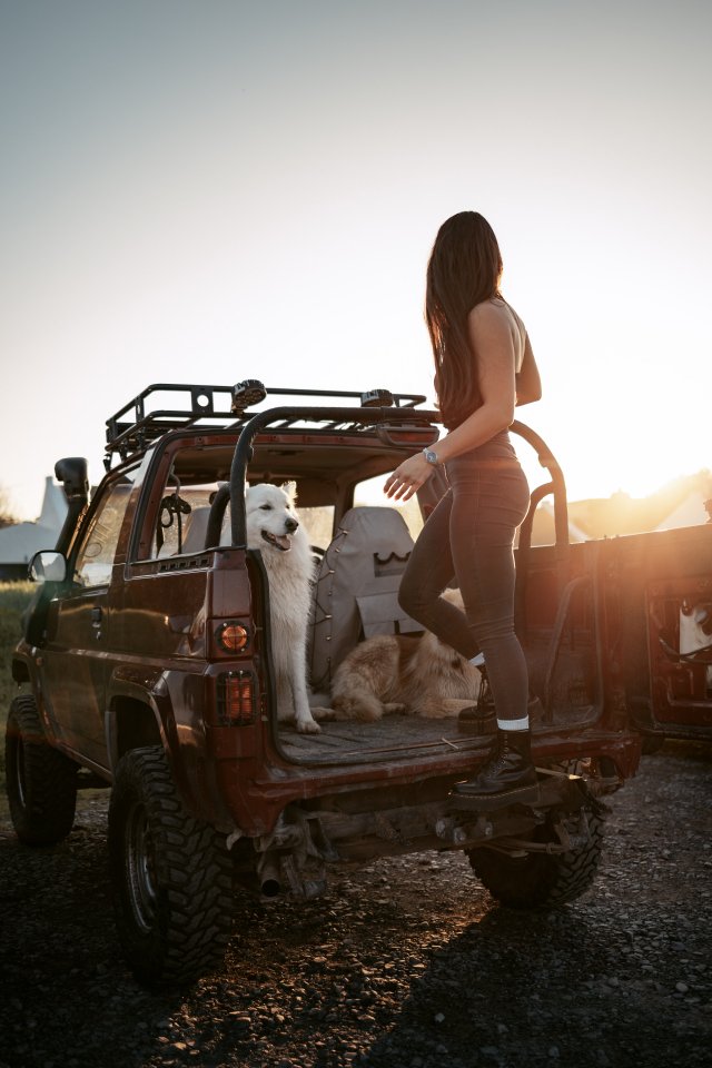 Обои: машина с собаками, девушка - 640x960