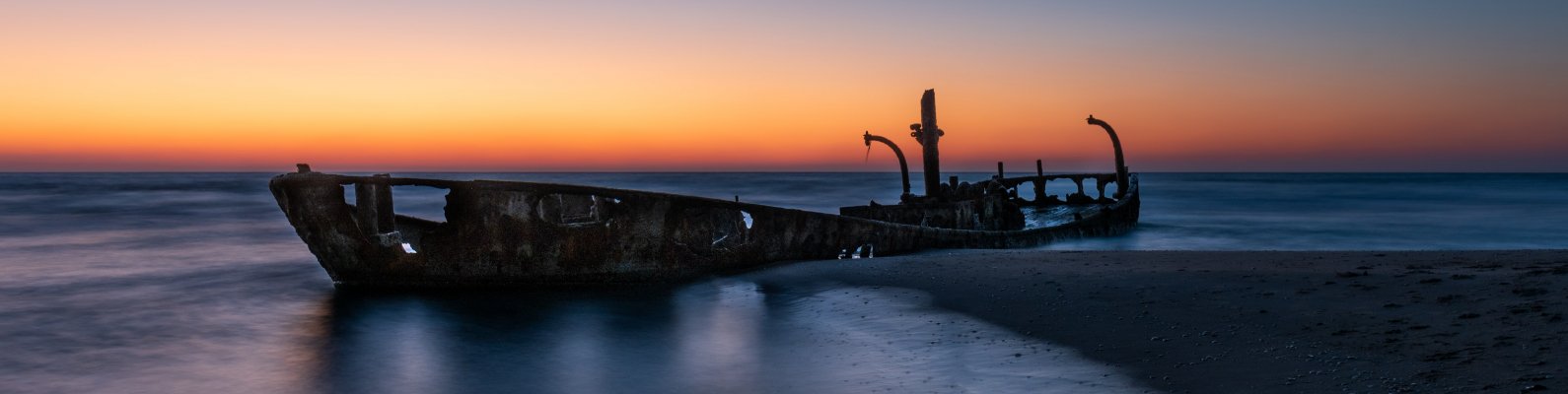 Обои: закат, заброшенный корабль - 1590x400