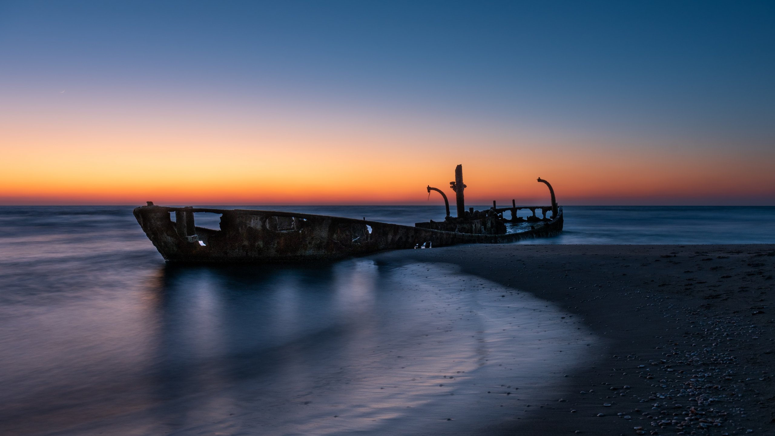Обои: закат, заброшенный корабль - 2560x1440