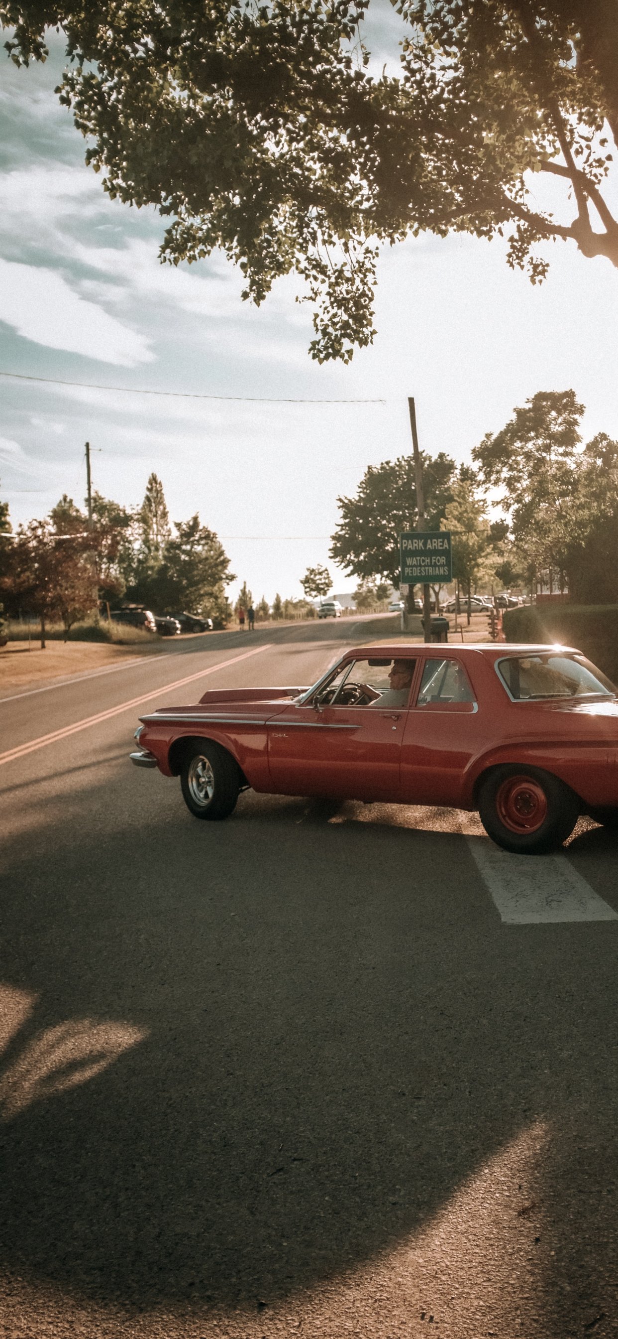 Обои: красная машина, город - 1242x2688