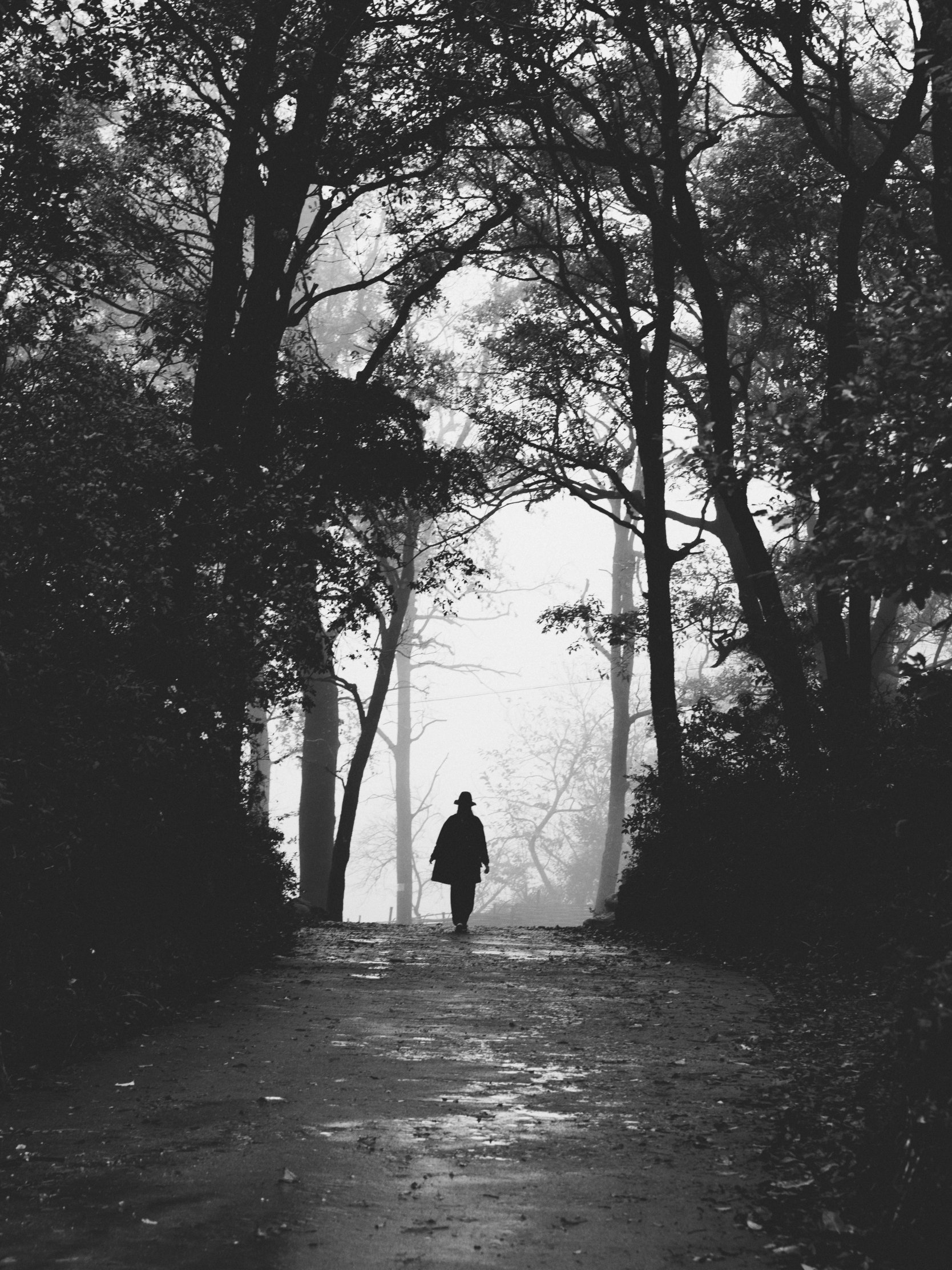 туманный лес, человек, снег