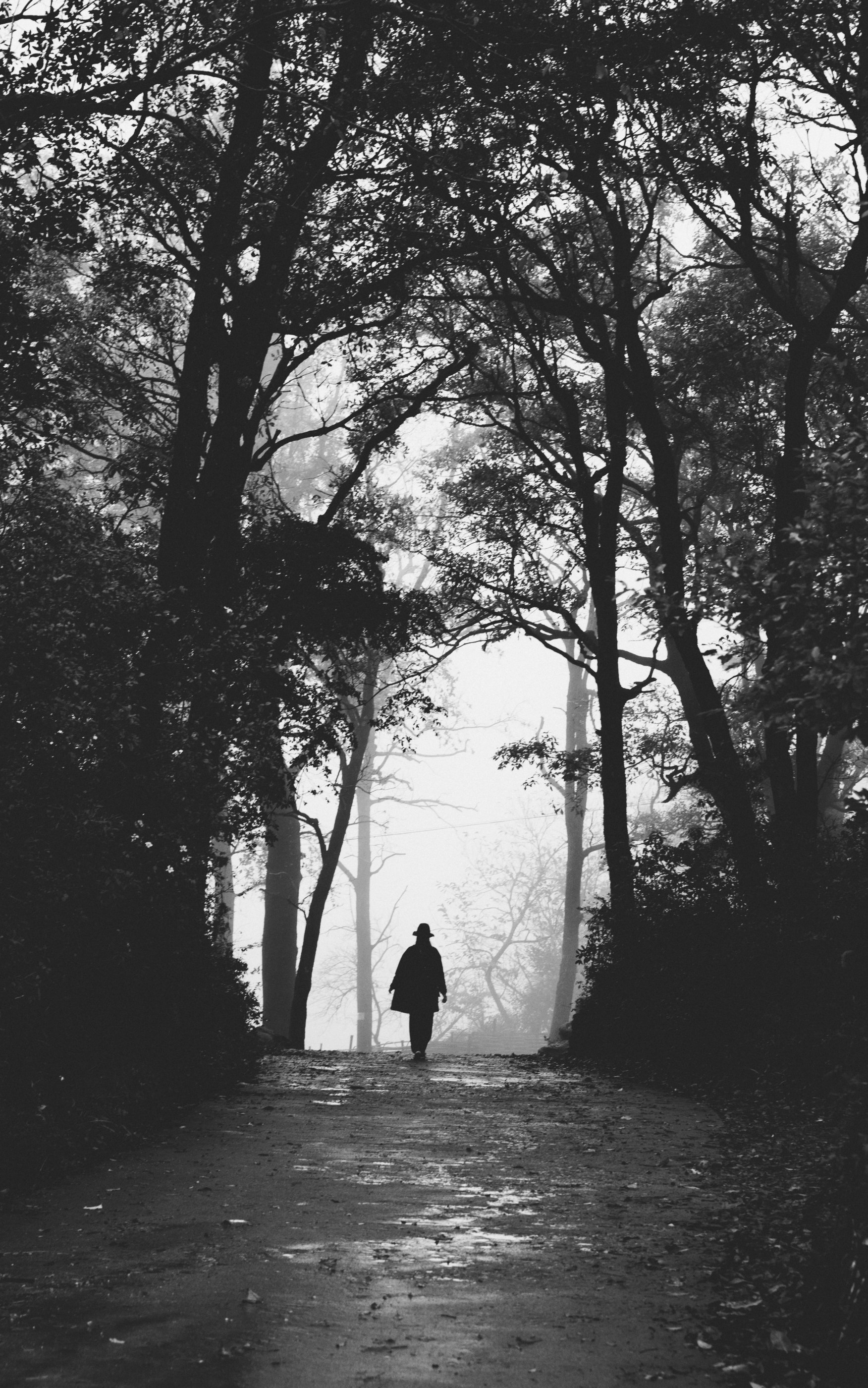 туманный лес, человек, снег