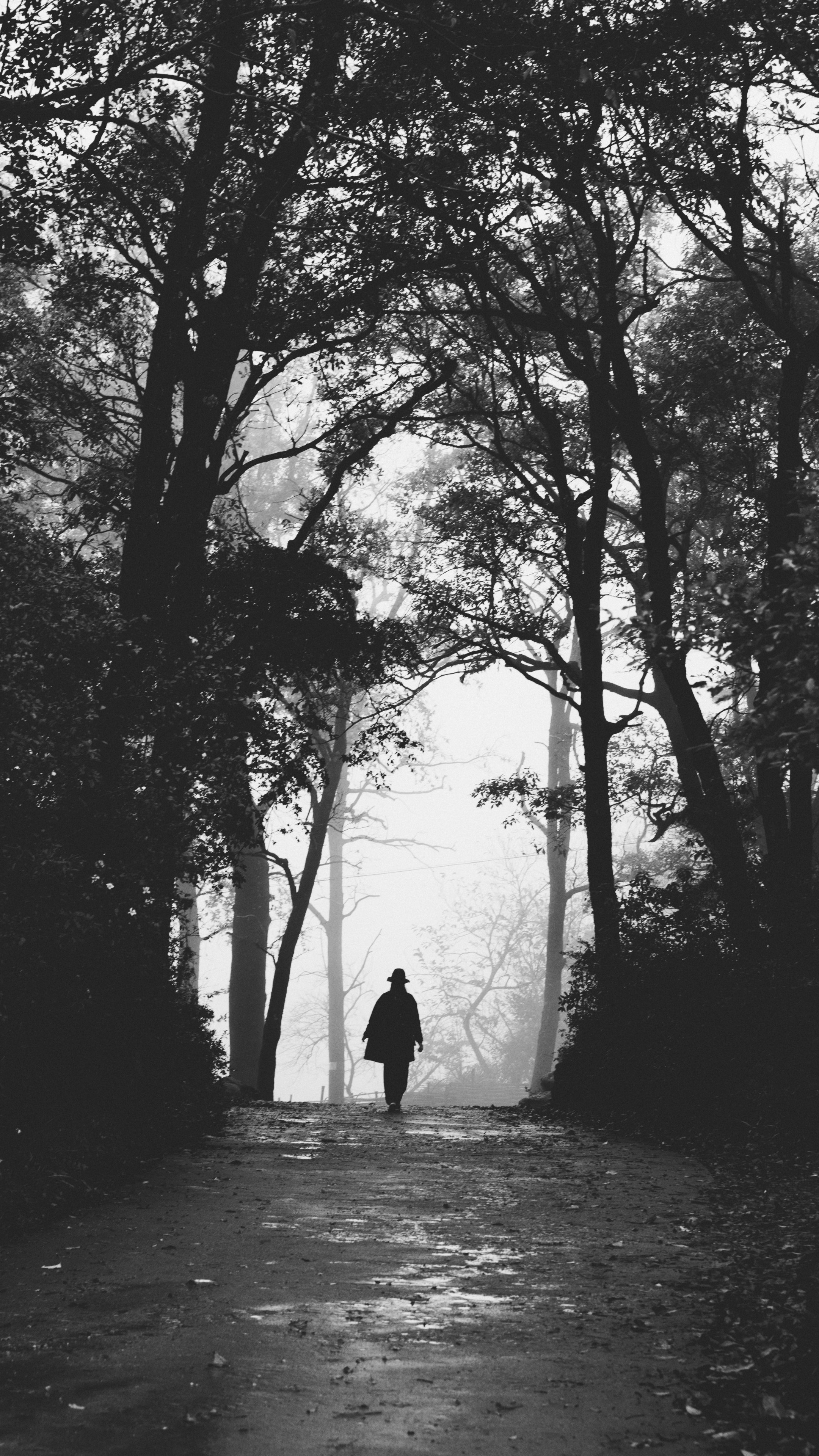 туманный лес, человек, снег