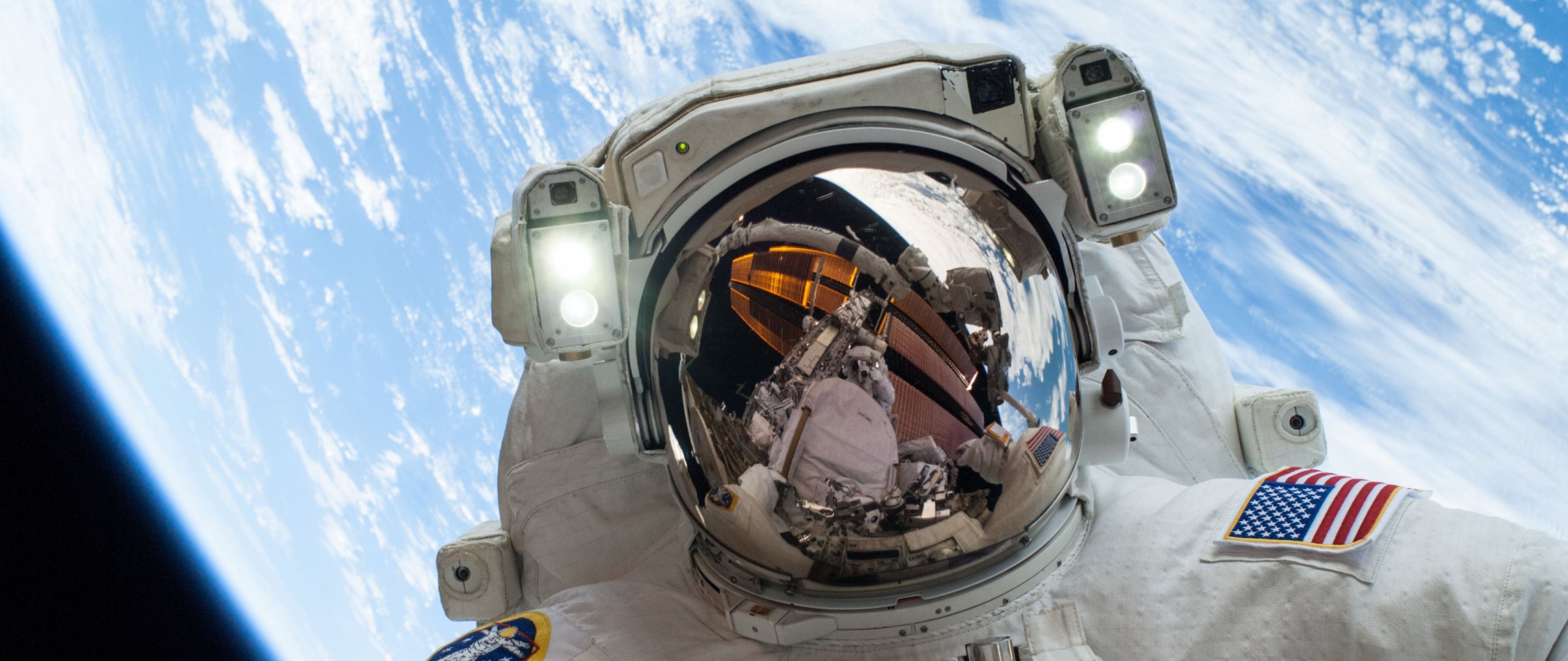 Обои: космонавт, селфи, планета Земля - 2560x1080
