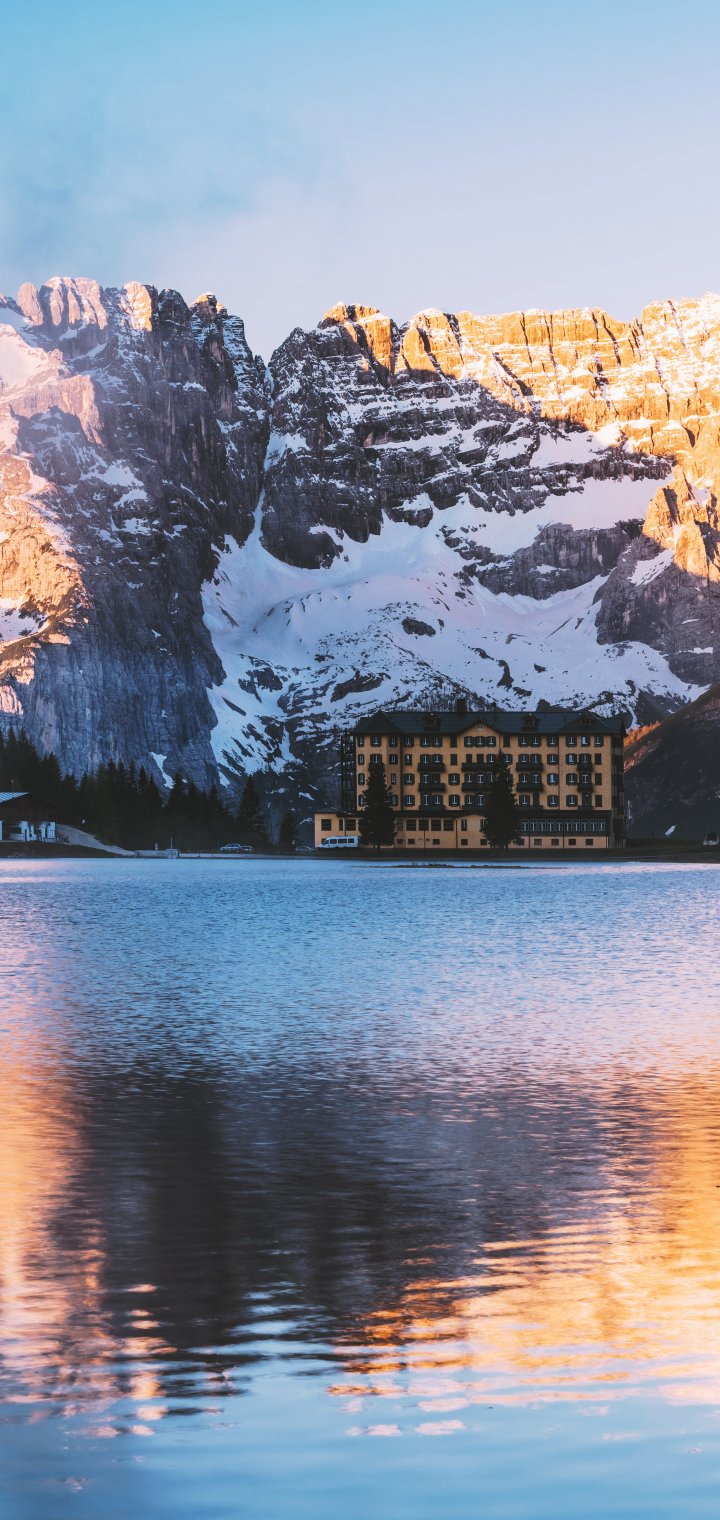 Обои: дом у озера, горный хребет - 720x1520