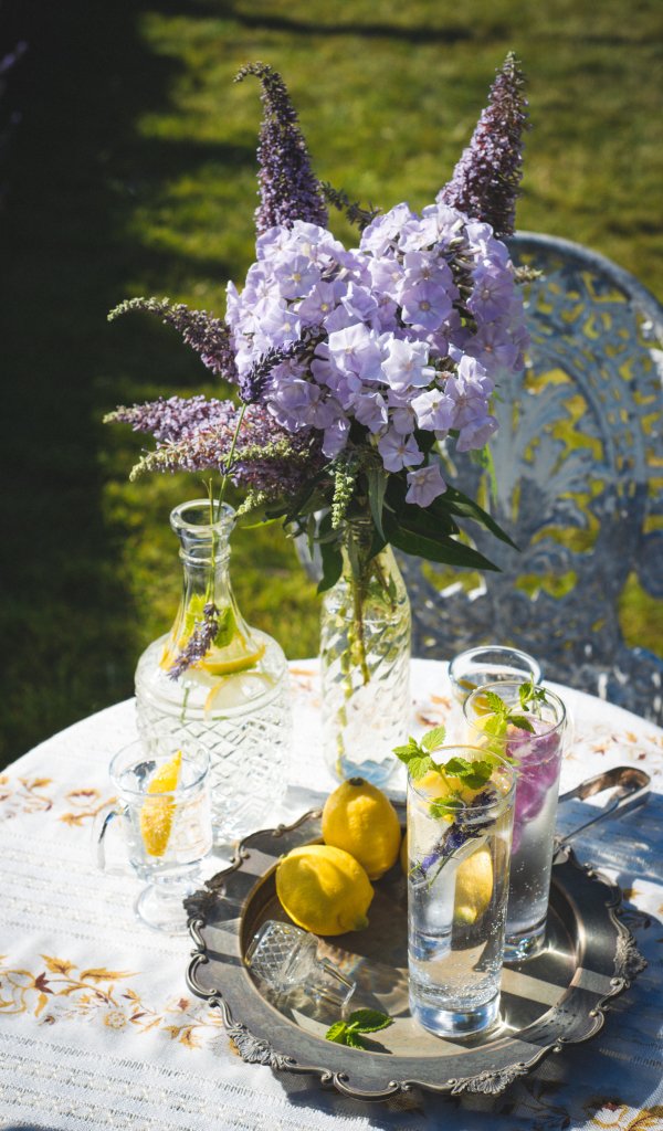 Обои: летний стол, букет - 600x1024