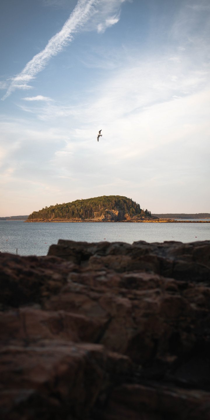 Обои: остров в озере, полет птицы - 720x1440