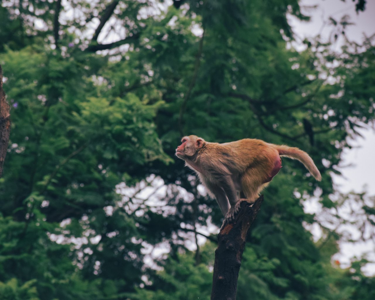 Обои: рыжая мартышка, прыжок на дереве - 1280x1024