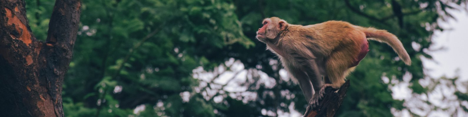 Обои: рыжая мартышка, прыжок на дереве - 1590x400