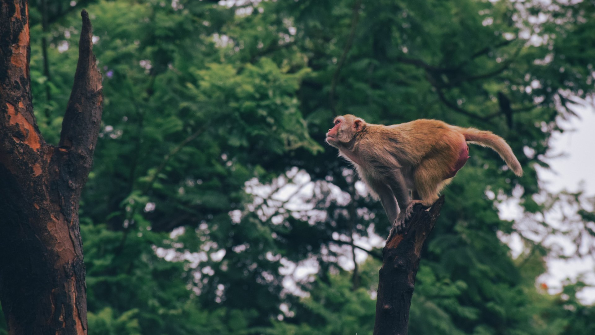 Обои: рыжая мартышка, прыжок на дереве - 1920x1080