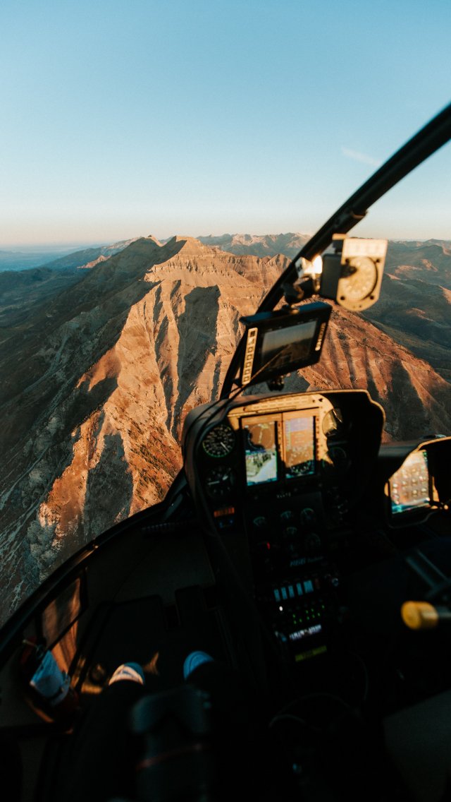 кабина вертолета, небоскребы, полет