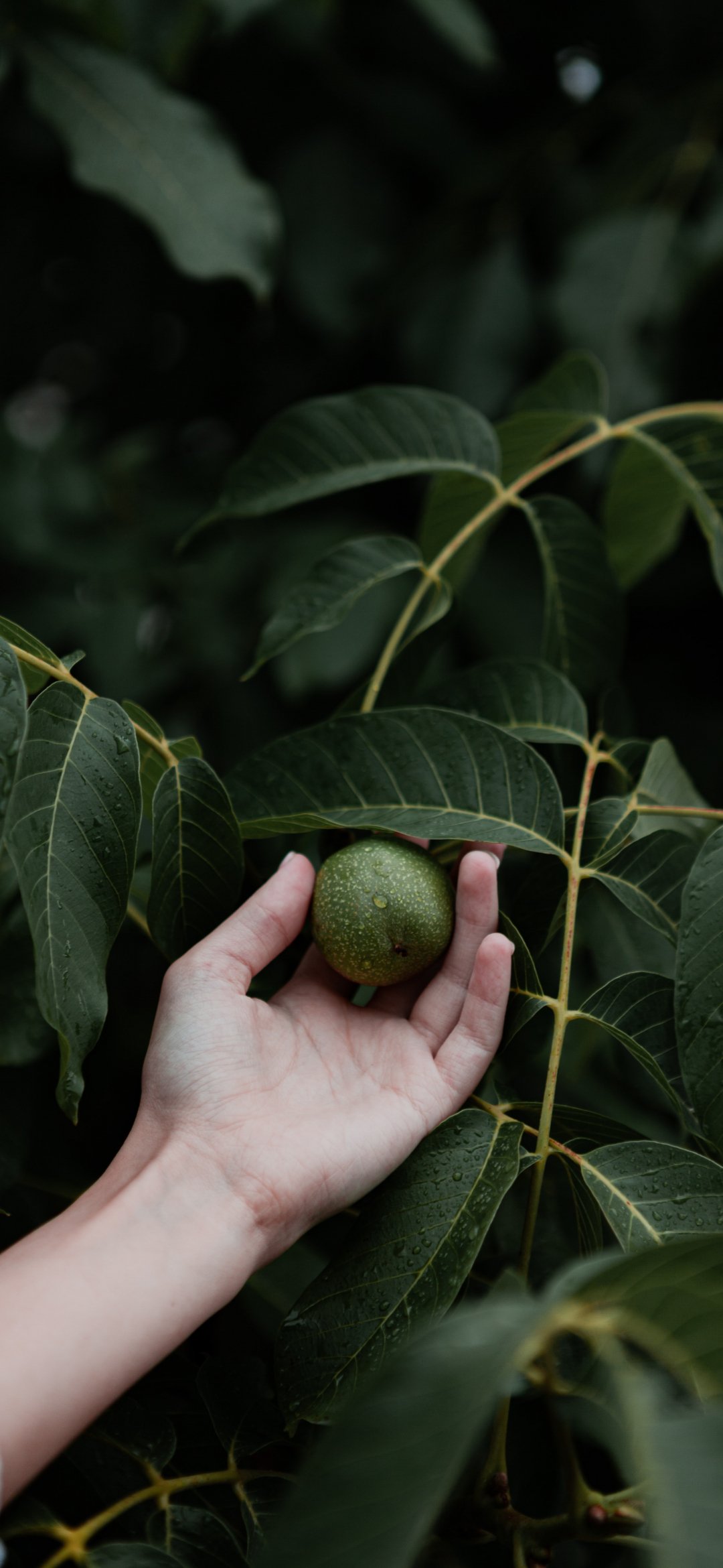 Обои: фрукт в руке, зеленые листья - 1080x2340