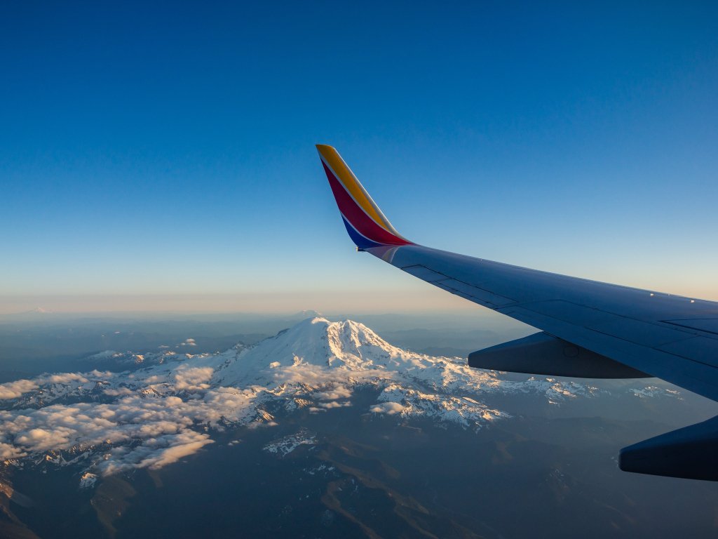 Обои: крыло самолета, полет, Маунт-Рейнир - 1024x768