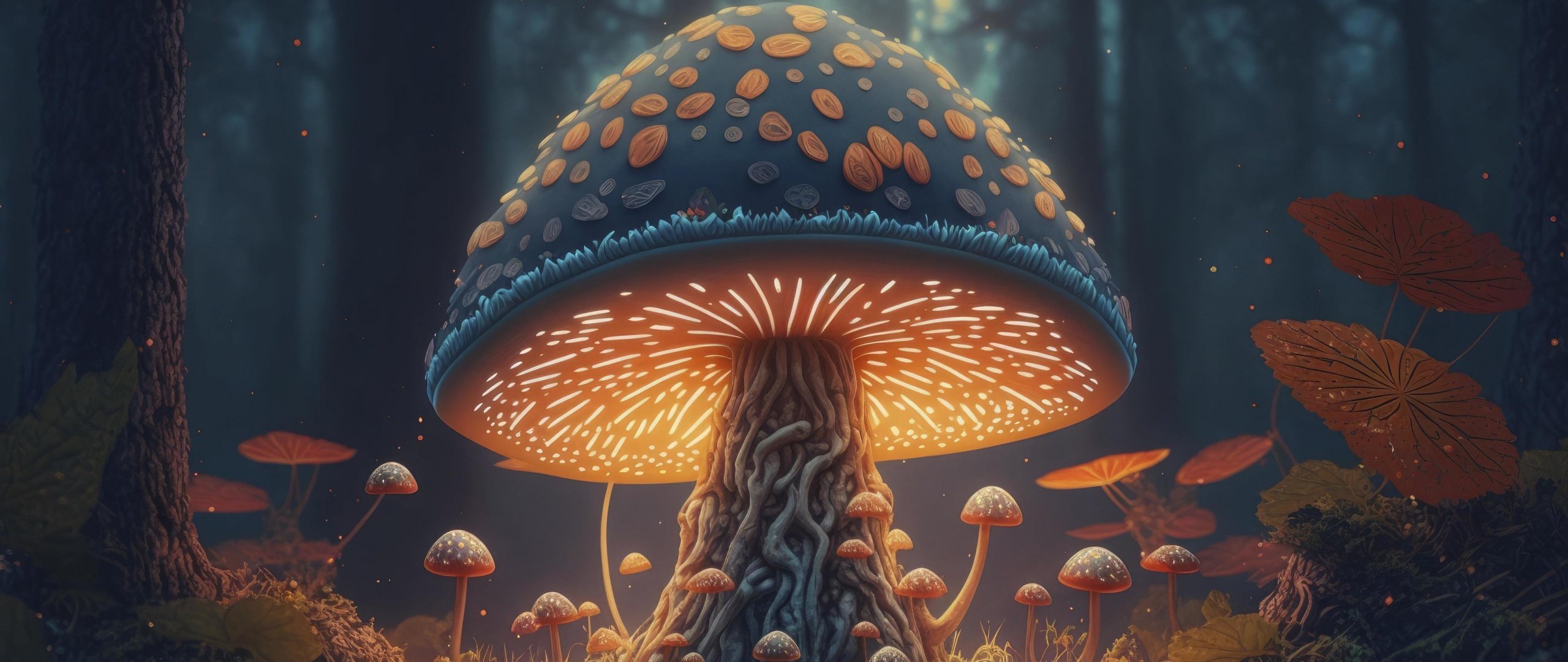 Обои: грибной лес, гриб, свечение - 2560x1080