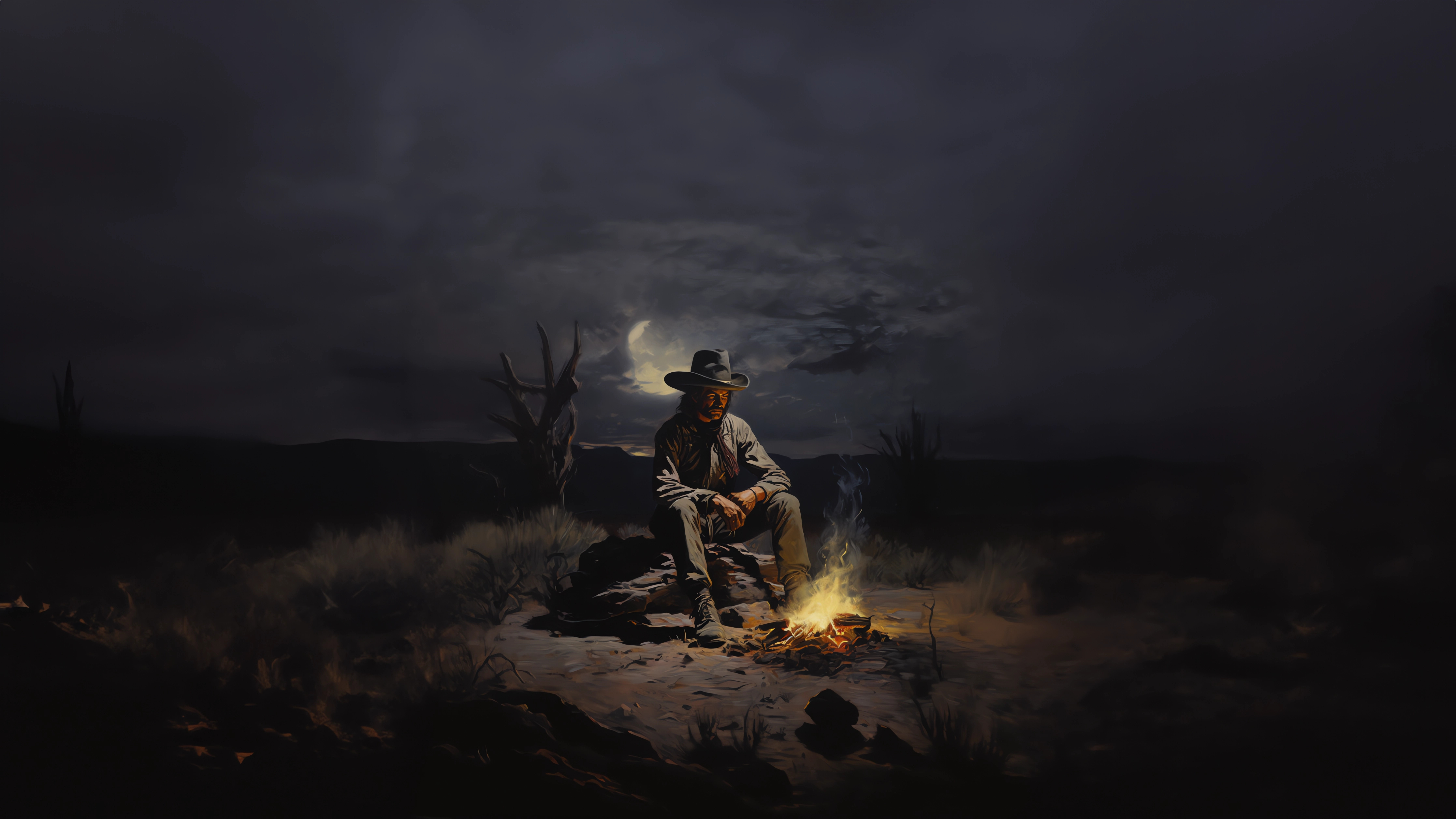 Обои: Дикий Запад, ковбой, ночь, костер - 4468x2512