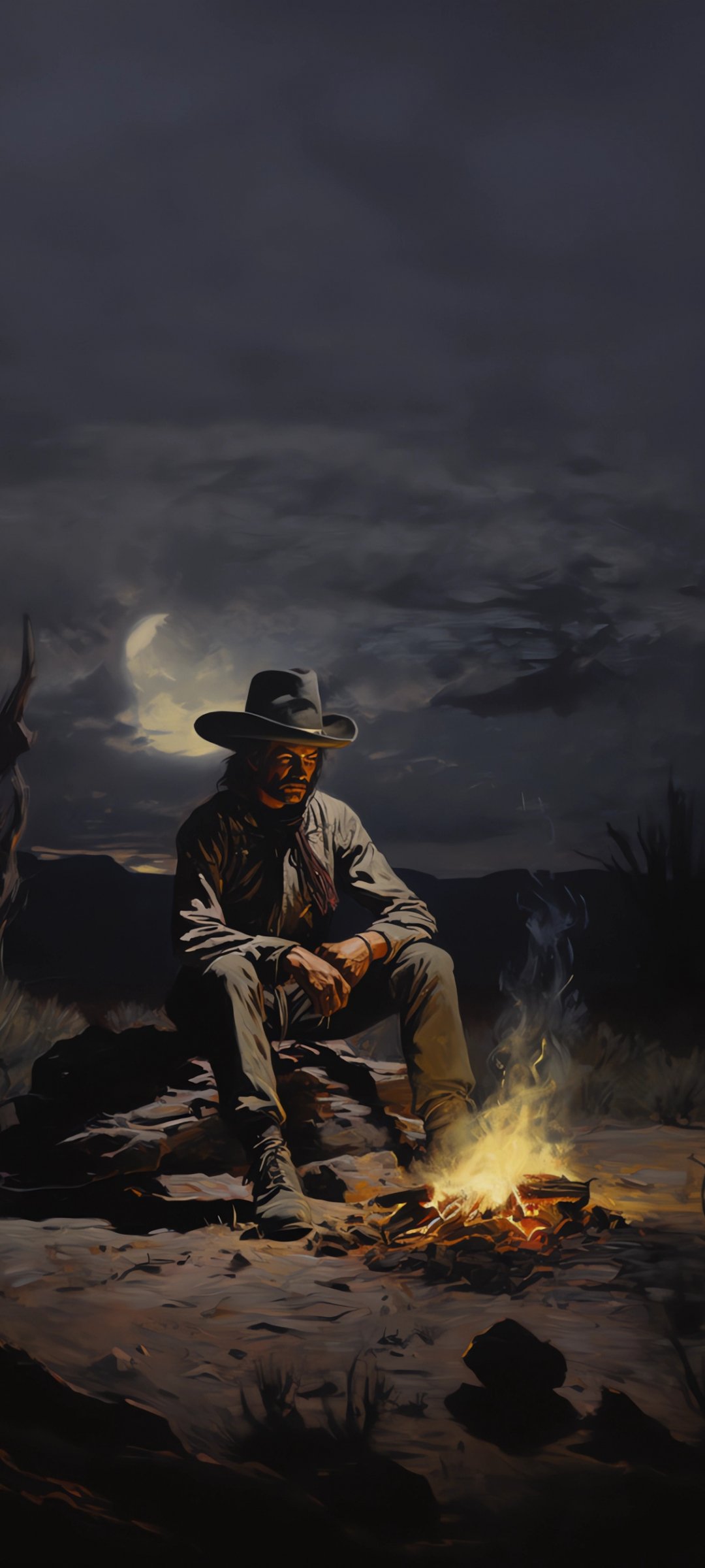 Обои: Дикий Запад, ковбой, ночь, костер - 1080x2400