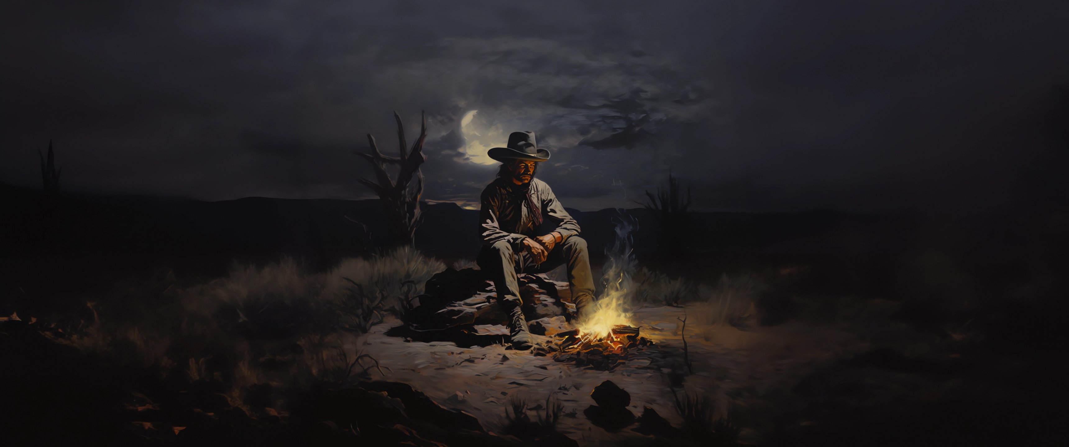 Обои: Дикий Запад, ковбой, ночь, костер - 3440x1440
