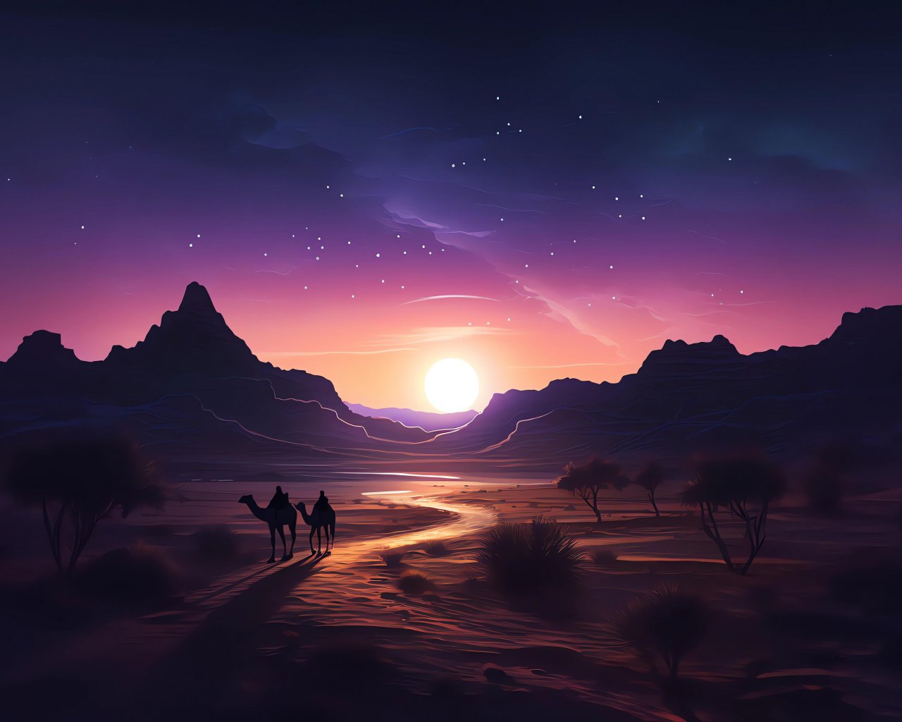 Обои: ночная пустыня, закат, темный - 1280x1024