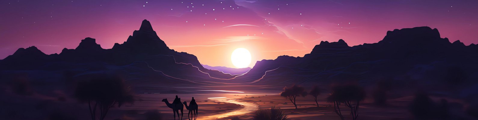 Обои: ночная пустыня, закат, темный - 1590x400