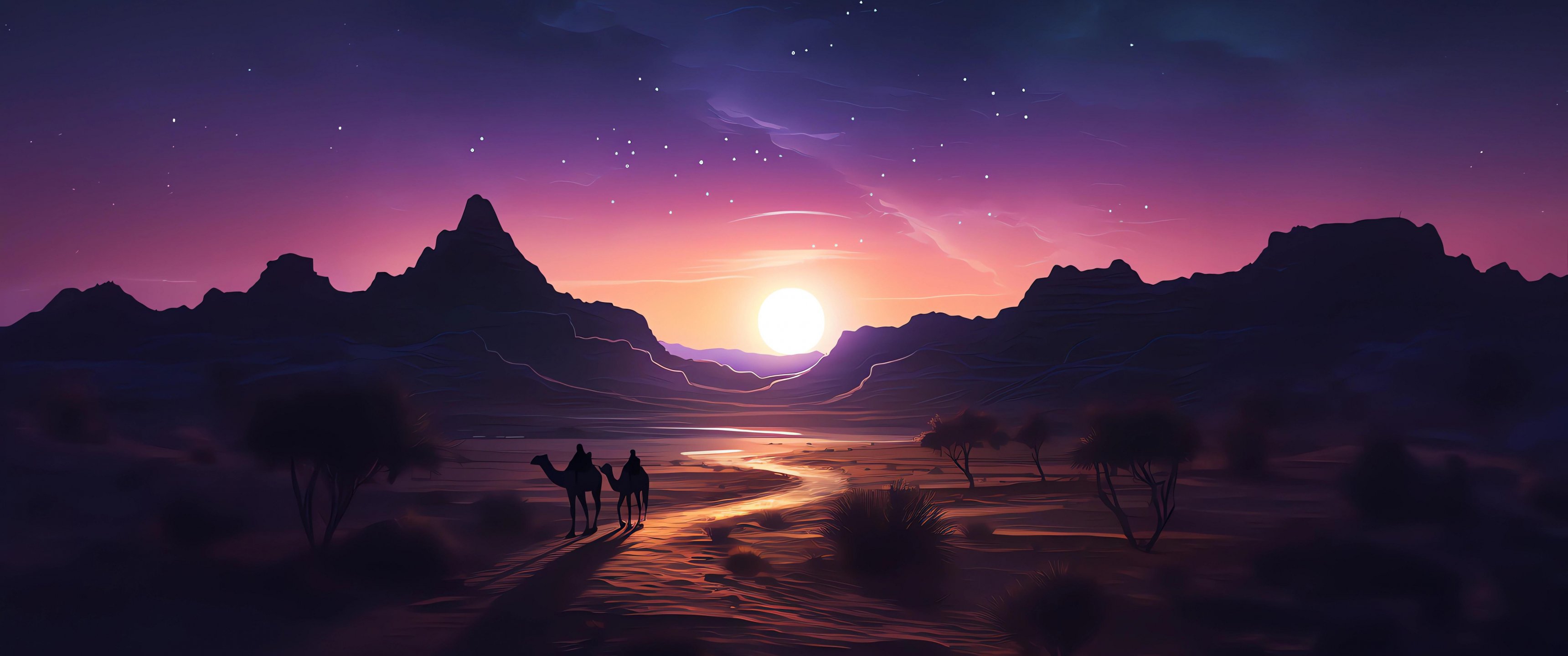 Обои: ночная пустыня, закат, темный - 3440x1440