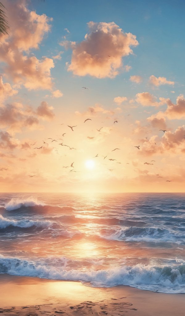 Обои: рассвет, пляж, море - 600x1024