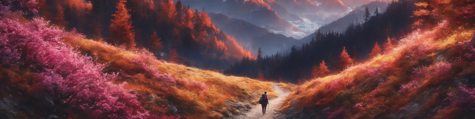 Обои: горная тропа, пейзаж, рассвет - 1590x400