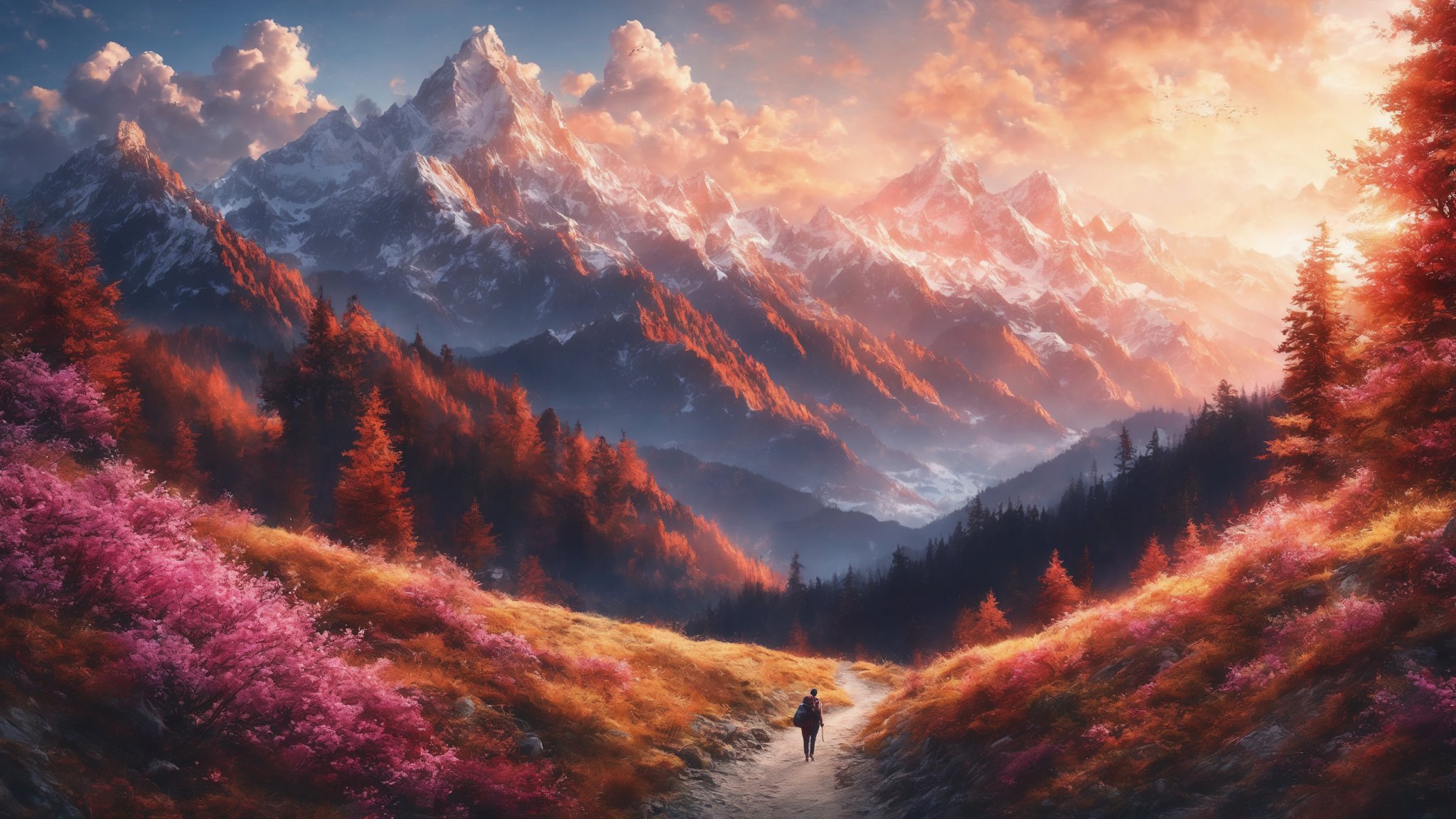 Обои: горная тропа, пейзаж, рассвет - 2048x1152