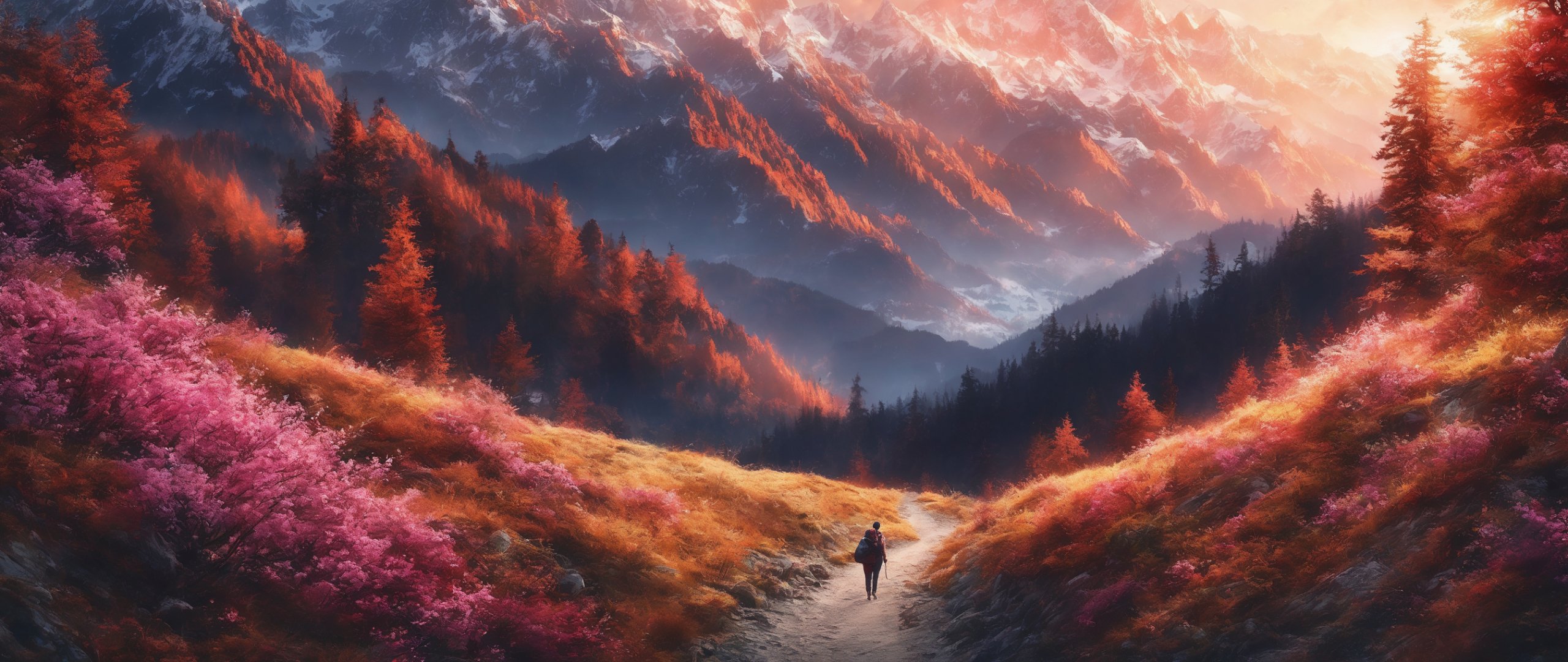 Обои: горная тропа, пейзаж, рассвет - 2560x1080