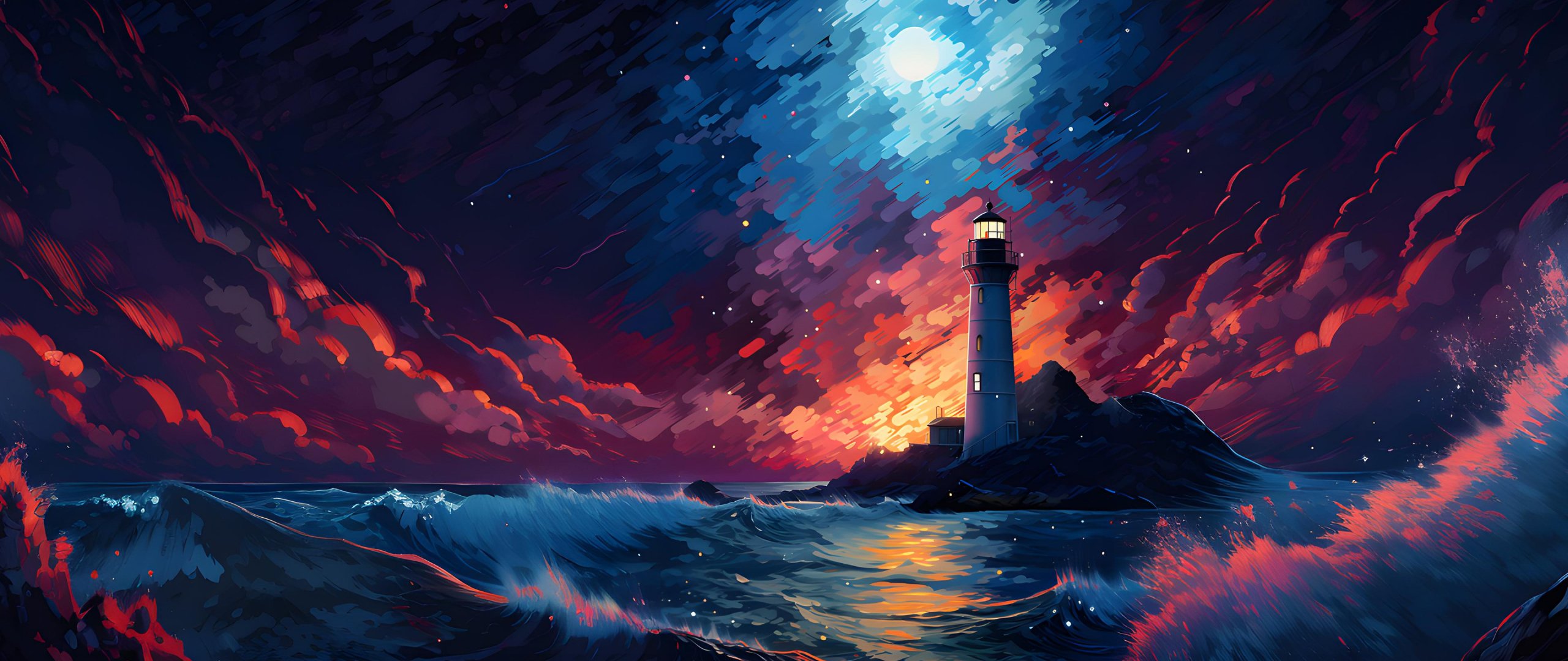 Обои: маяк, шторм, ночь, волны - 2560x1080