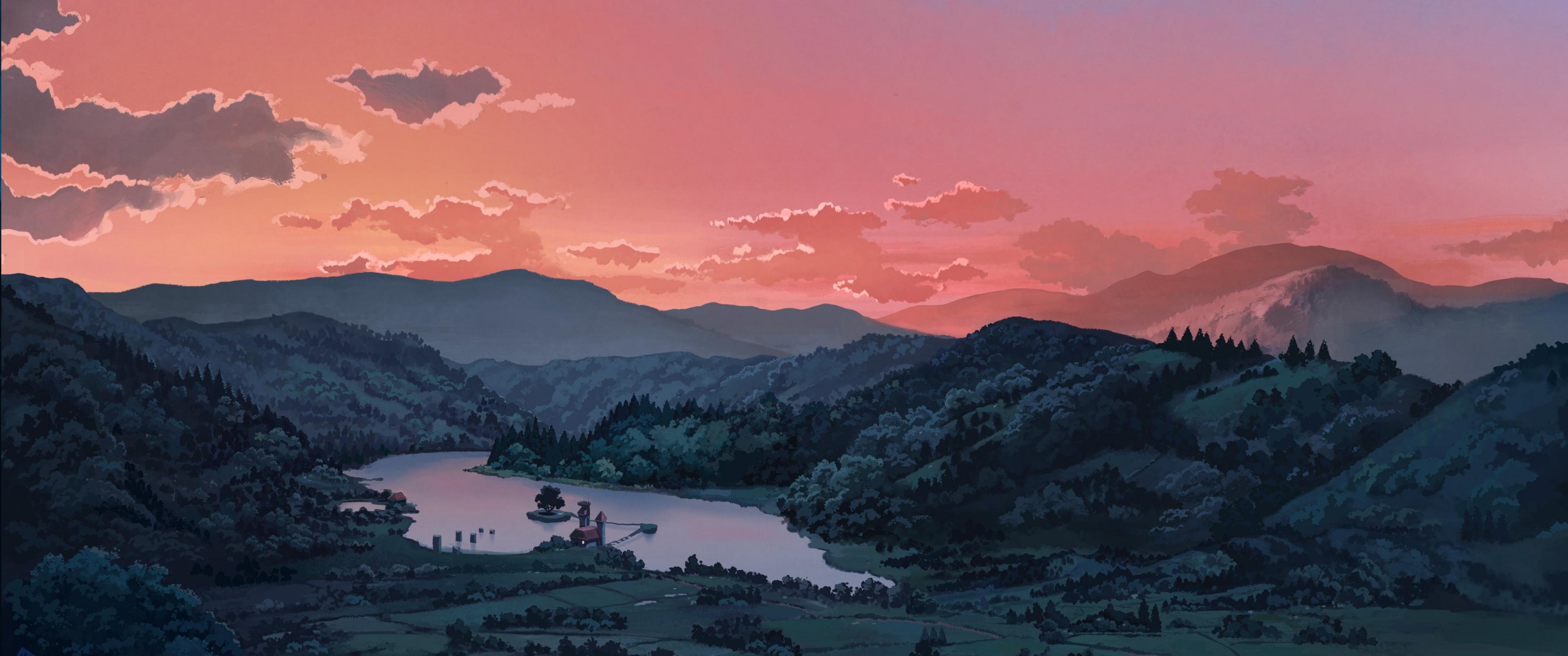 Обои: пейзаж, долина, рисунок - 3440x1440