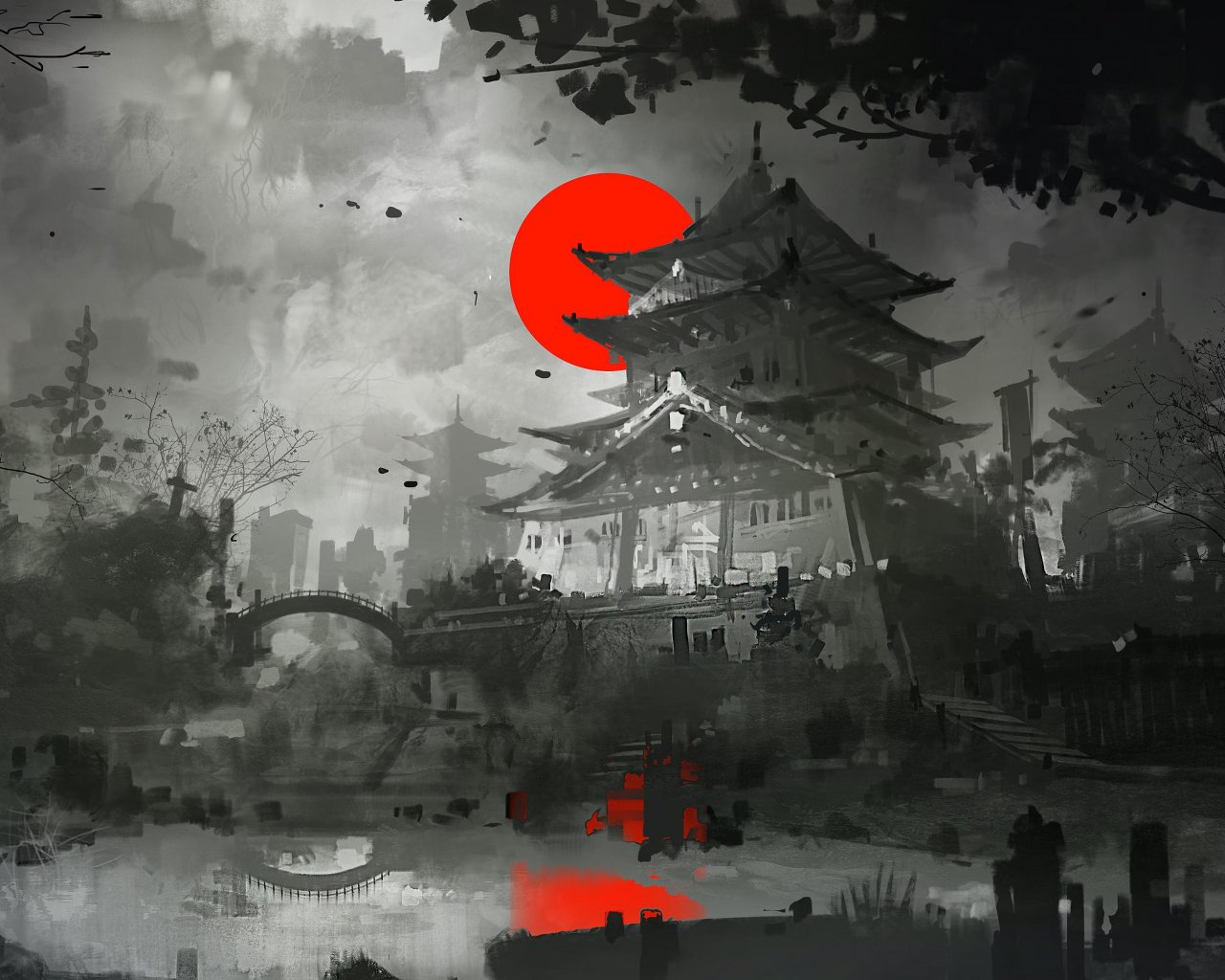 Обои: рисунок, Япония, серый, темный - 1280x1024