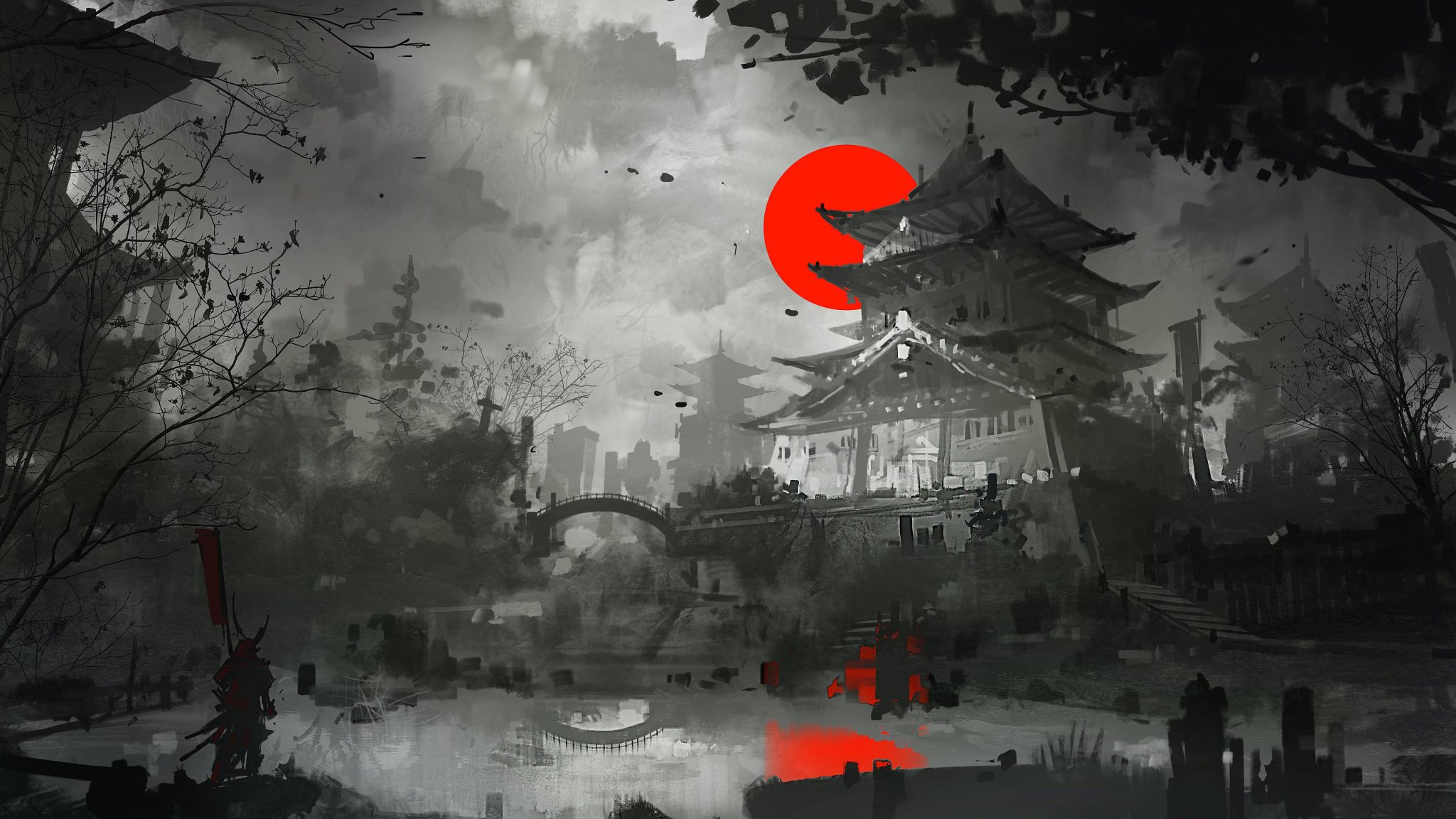 Обои: рисунок, Япония, серый, темный - 2048x1152