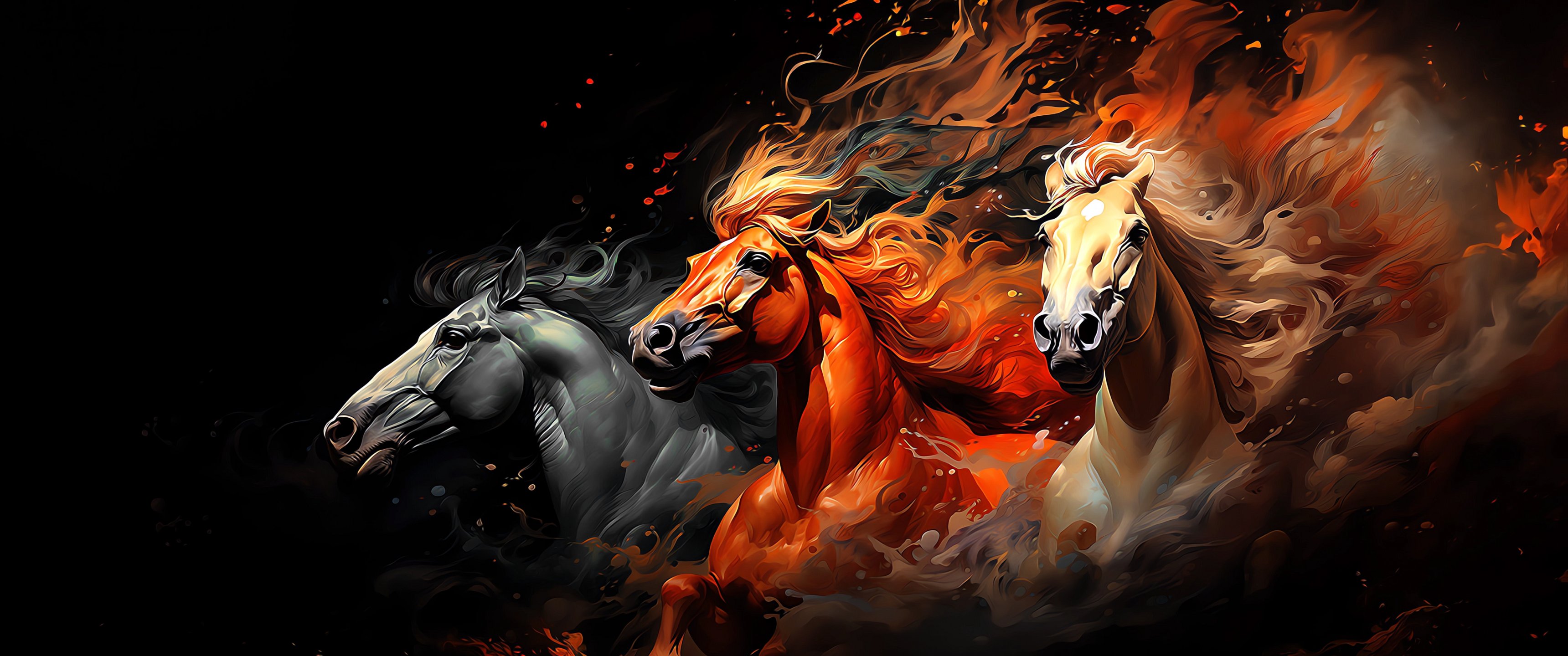 Обои: тройка лошадей, на черном фоне - 3440x1440