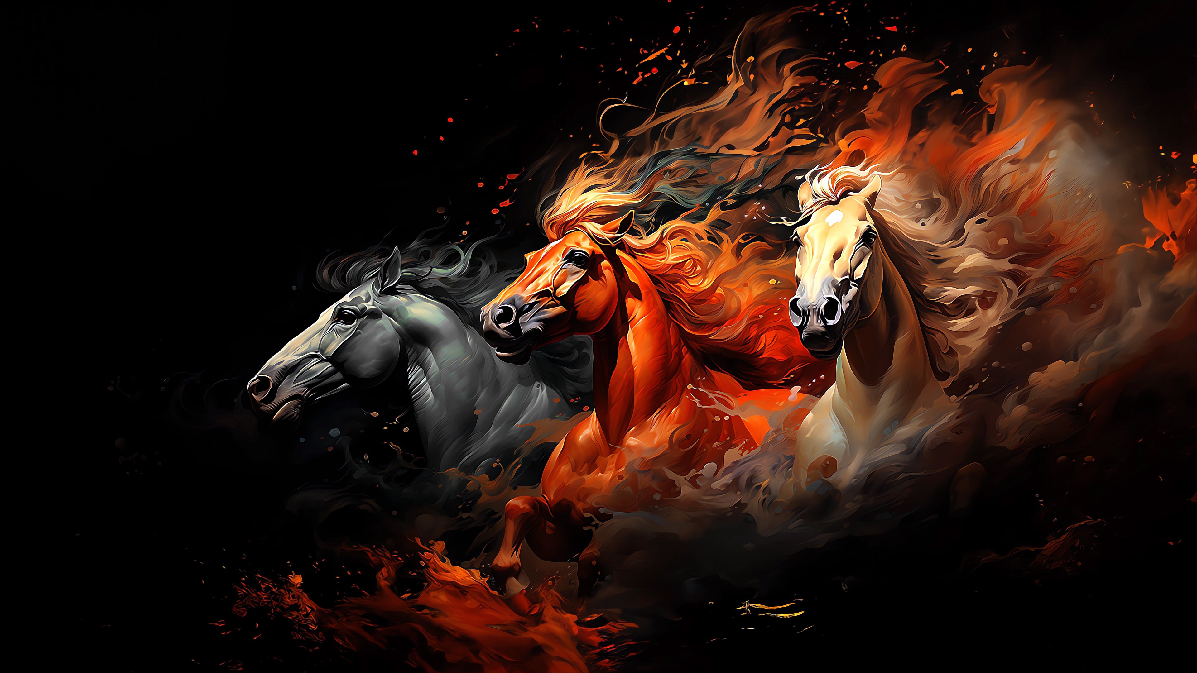 Обои: тройка лошадей, на черном фоне - 3840x2160