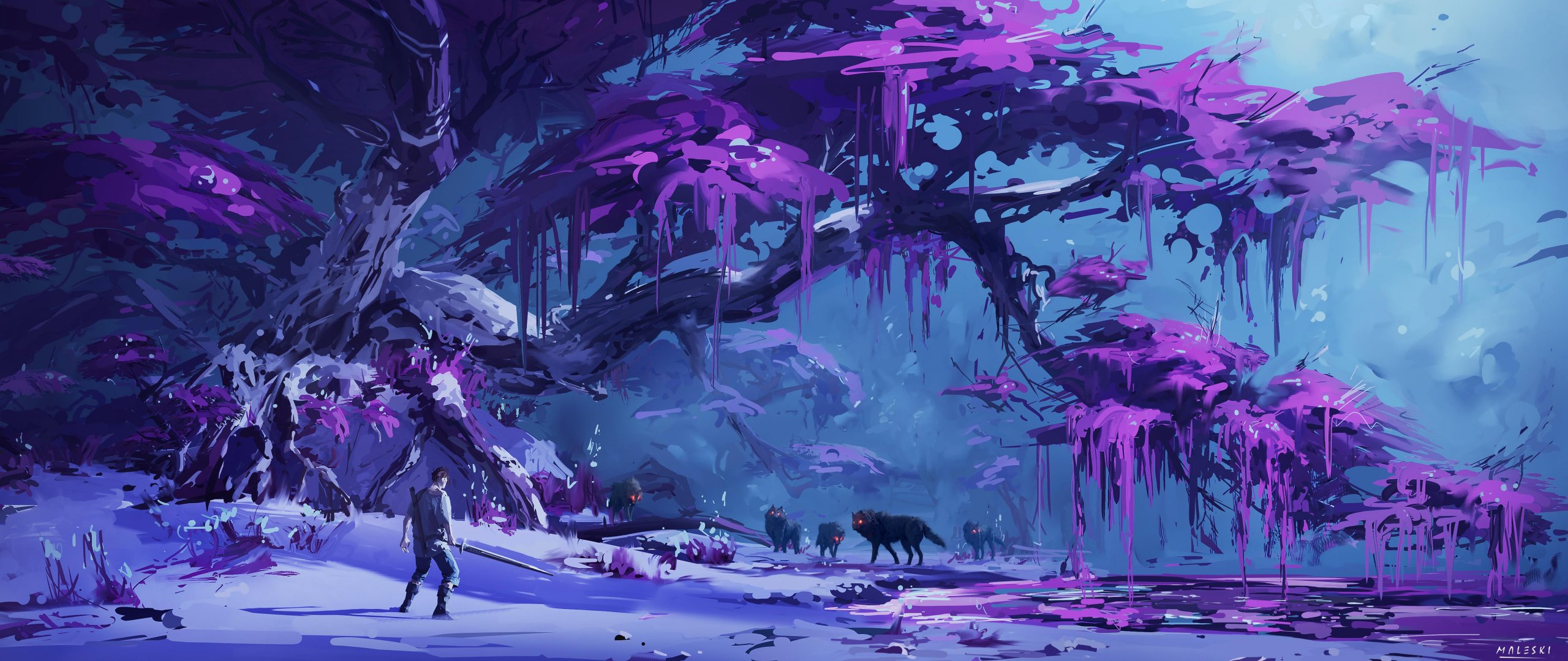 Обои: фиолетовый, лес, фантастика - 2560x1080