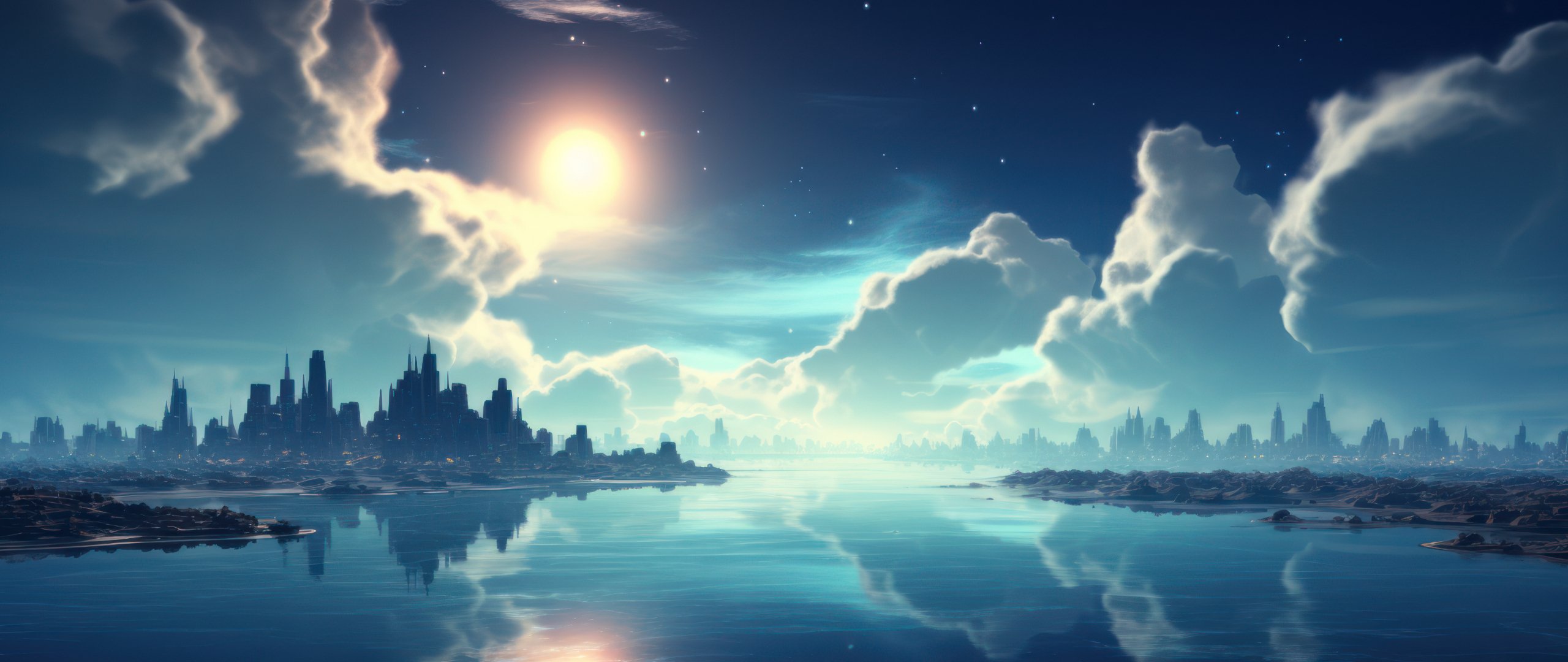 Обои: синий, ночь, пейзаж, город - 2560x1080