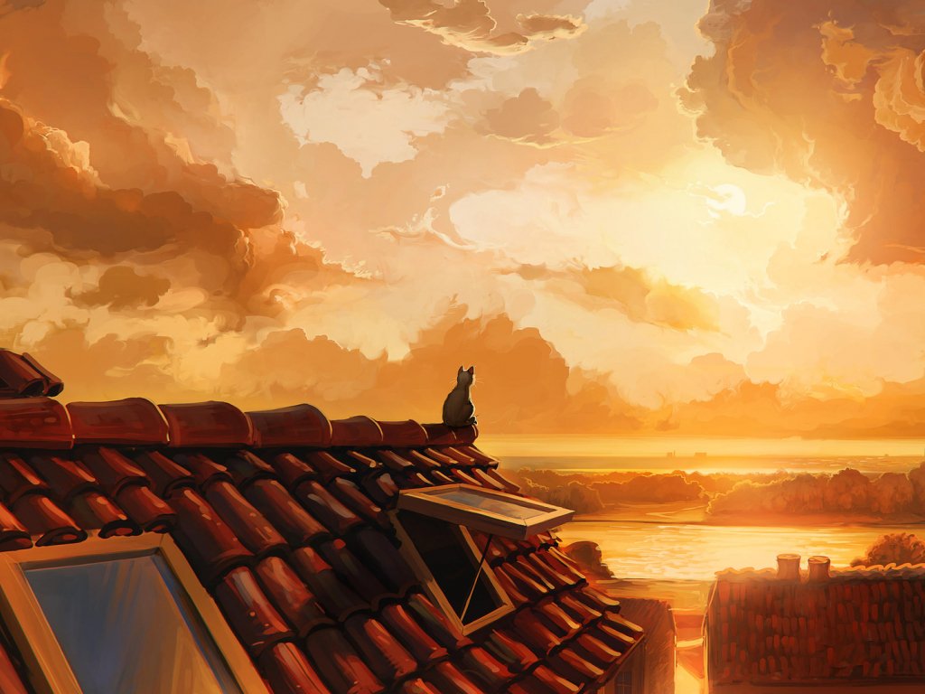 Обои: кот на крыше, закат, оранжевый - 1024x768