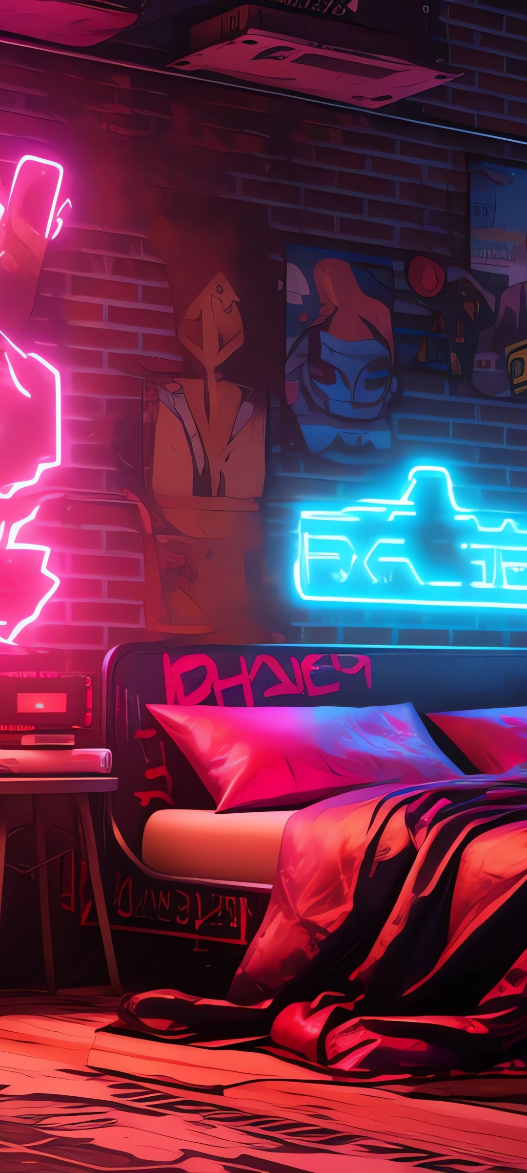 Обои: неон, постель, комната, киберпанк - 1080x2400