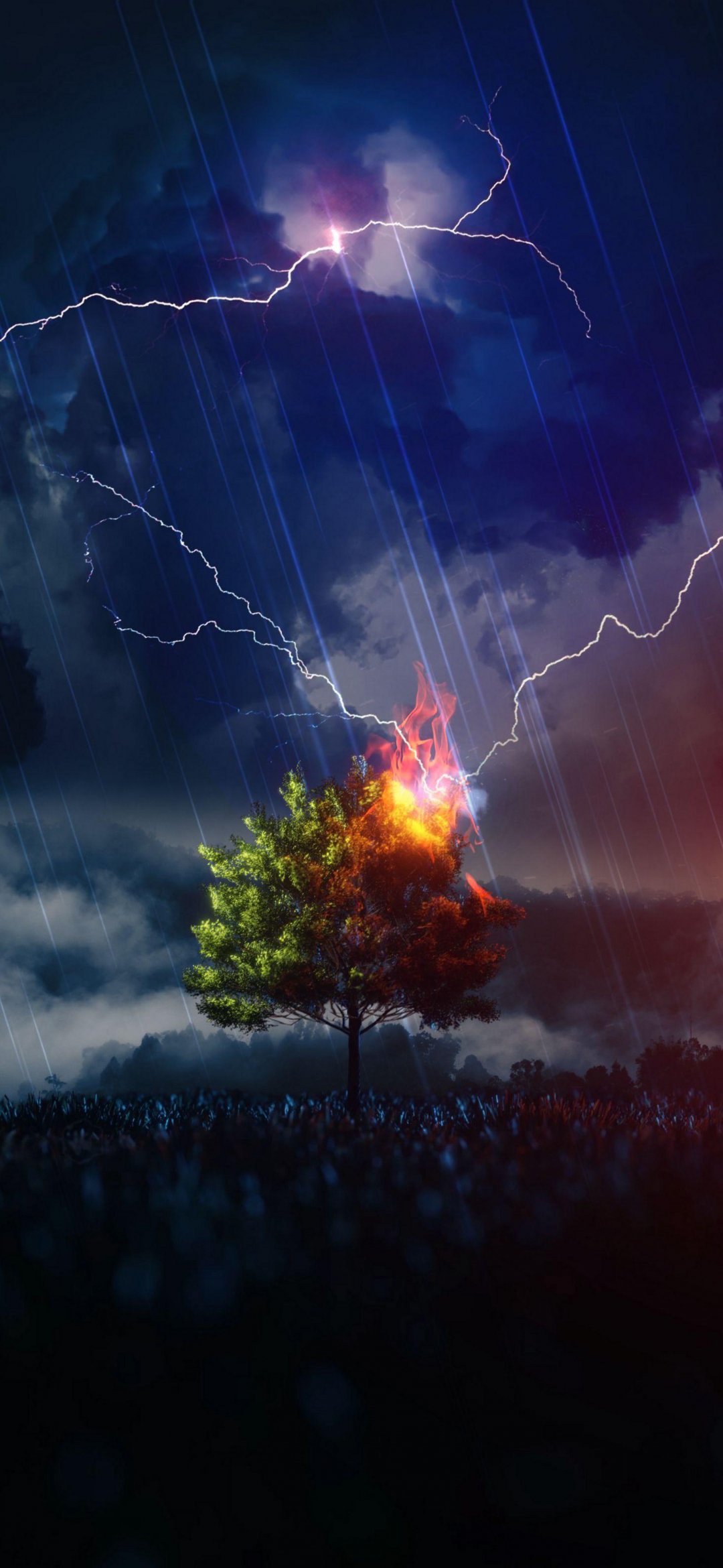 Обои: молния, дерево, ночь, гроза - 1080x2340