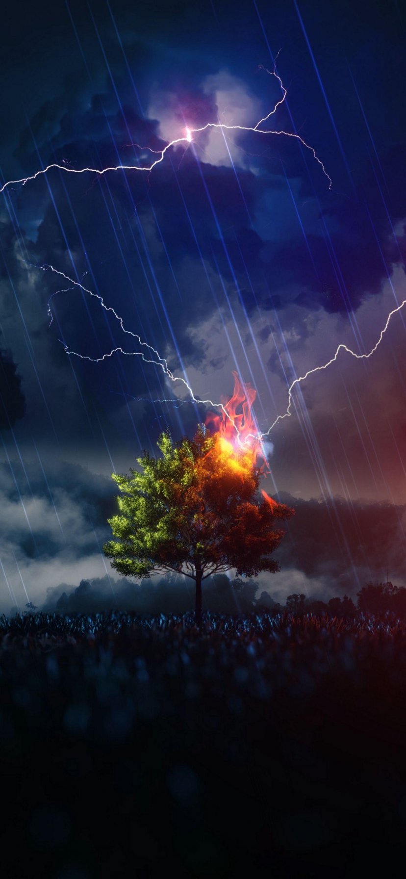 Обои: молния, дерево, ночь, гроза - 828x1792