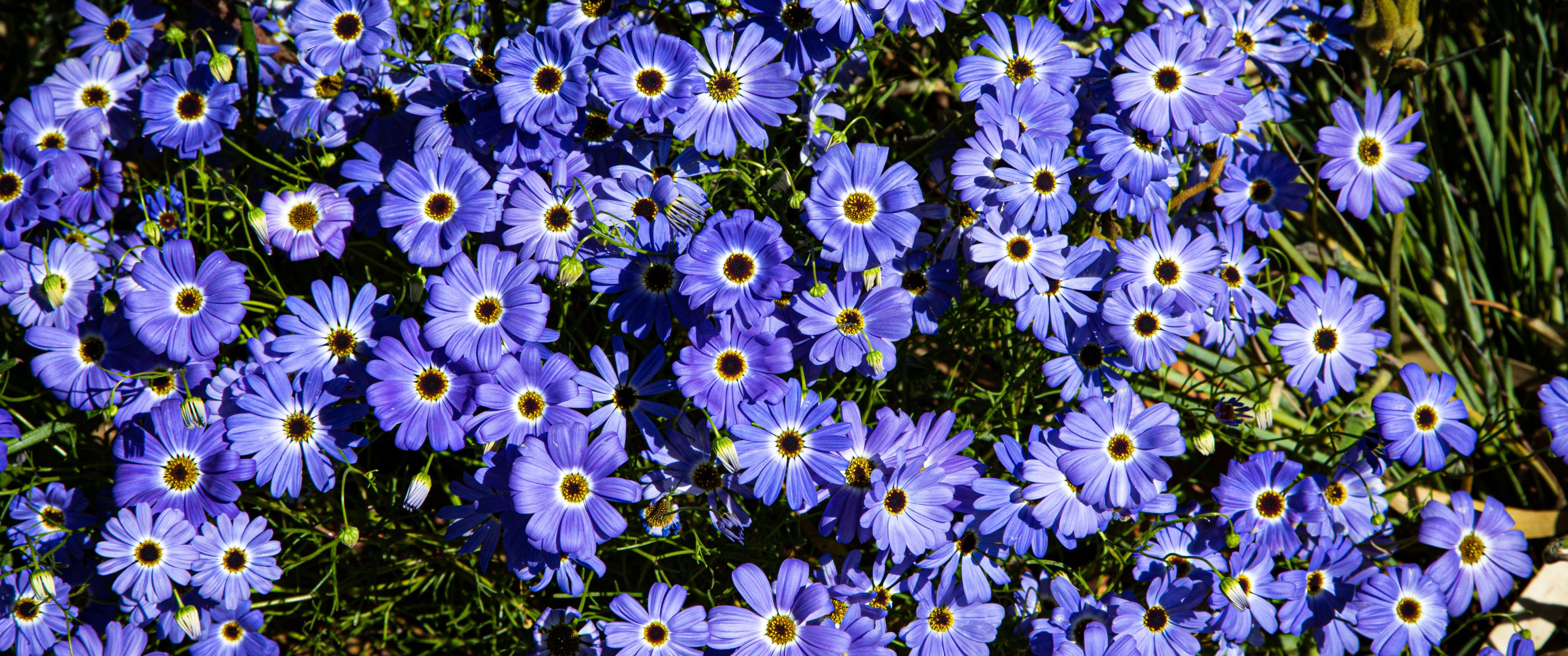 Обои: Брахикома, синие цветы, клумба - 3440x1440