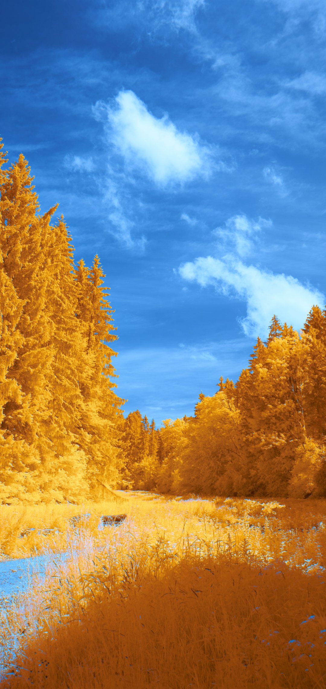 Обои: лес, желтый, голубой - 1080x2280