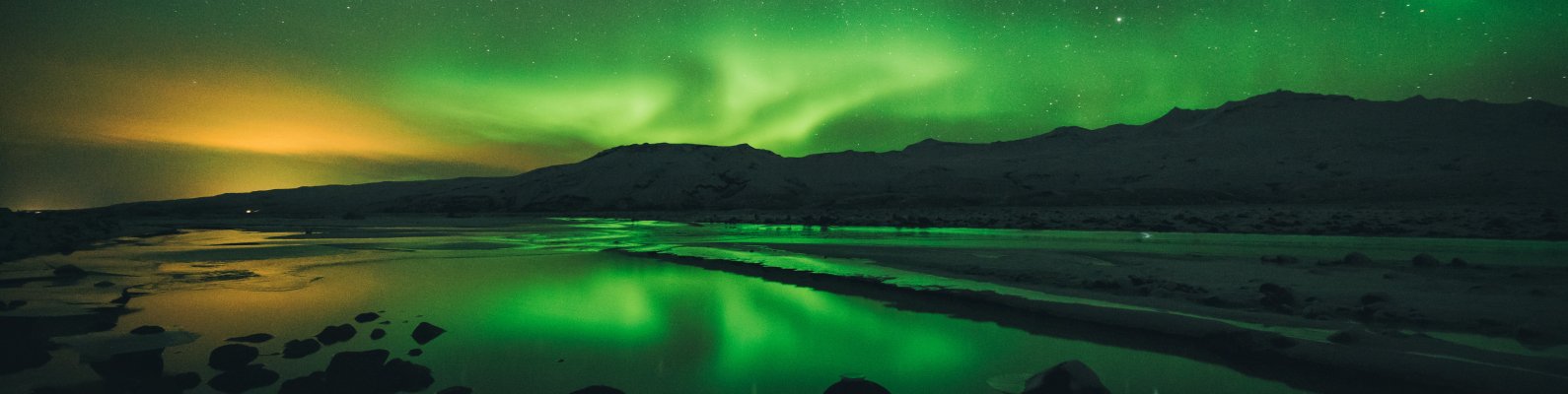 Обои: северное сияние, пейзаж, зеленый - 1590x400